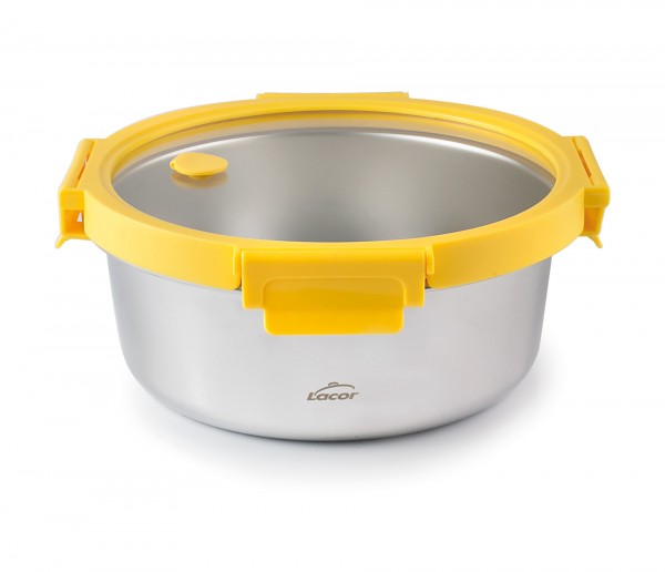 -Recipiente de acero inoxidable 18/10 apto para el microondas y tapa de cristal con válvula para dejar circular el aire.