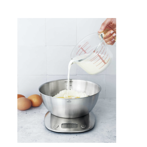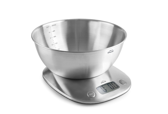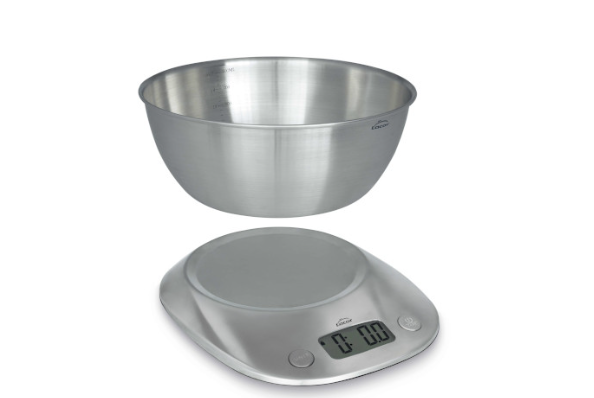 Báscula digital de alta precisión con bol extraíble de acero inoxidable.· Diseño elegante y compacto. Capacidad de 1,8 L. Peso máx.: 5kg / División: 1 g· Pantalla LCD grande y legible con función TARA.· Indicador de batería baja y sobrecarga.· Apagado automático, ahorro de energía.· Unidad de peso: g / lb:oz / water-ml / milk-ml / fl.oz· Fuente de alimentación (incluida): 2 pilas de 1,5 V AAA.