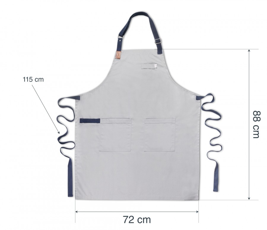 Confeccionado en tejido de algodón y poliéster.Diseñado con dos bolsillos en la parte inferior.Cintas 100% algodón orgánico en color azul con una longitud de 115 cm (60085) y de 97 cm (60087).Ajustable en altura gracias a la hebilla reforzada con remaches metálicos (60085).Apto para la lavadora (30º) y la secadora. Se recomienda planchar a baja temperatura.Unisex. Talla única ajustable.especificacionesREF60085Medidas (cm)72x88